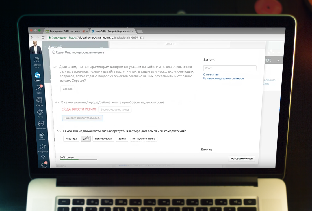 В случае когда надо связаться и квалифицировать клиента (выяснить какие именно регионы его интересуют) в amoCRM был настроен скрипт телефонных разговоров.